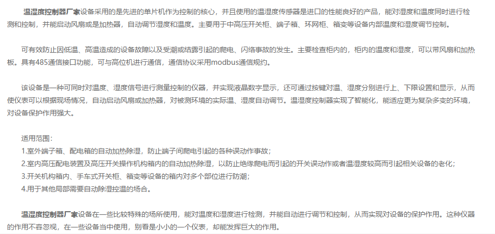 温湿度控制器产品主要用于中高压开关柜、端了箱、环网柜、箱变等设备内部温度和湿度的调节控制。可有效防止因低温、高温造成的设备故障以及受潮或结露引起的爬电、闪络事故的发生。